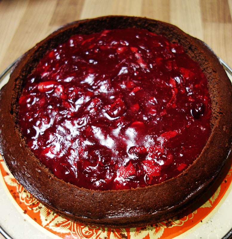 ![]() Kirschfüllung auf dem Kuchenboden verteilen.